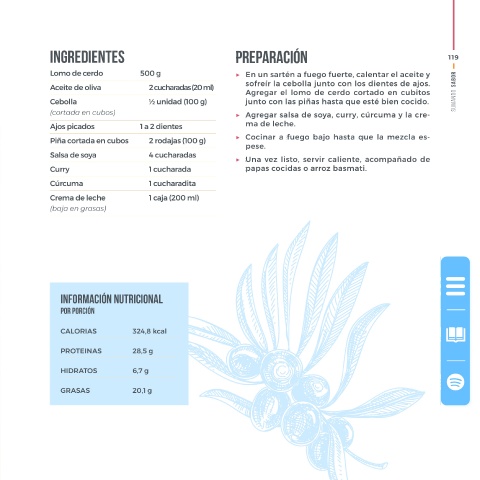 Ajos picados 1 a 2 dientes ▶ Agregar salsa de soya, curry, cúrcuma y la cre-