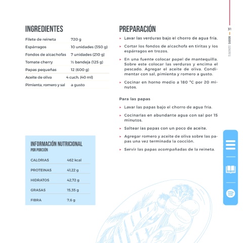 4 porciones Papas pequeñas 12 (600 g) pescado. Agregar el aceite de oliva. Condi-