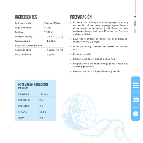 de quinoa blanca 20’ 4 porciones Palta madura 1 (200 g) ▶ Picar pepino y tomate en cuadritos peque-
