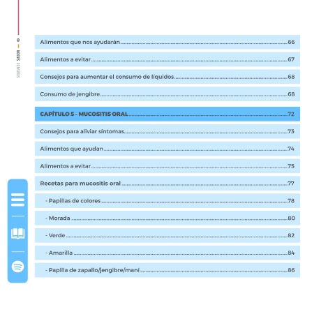 Recetas para mucositis oral ....................................................................................................................................77 Alimentos para aliviar síntomas ..............................................................................................................................102